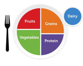 1992年版のように穀物をたくさん摂って他を少なくするのではなく、皿を4分割し、野菜、果物、炭水化物、タンパク質を同じように並べ、横に乳製品が置かれました。「皿の半分を野菜と果物にする」というメッセージが一瞬で理解できるように工夫されたのです。そして、蛋白質は炭水化物(Grains)よりも少なく設定されていました。