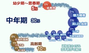 では、自身の努力で下げられる認知症の最大のリスクとは何か。それがコレステロールなのです。2020年のバージョンにはコレステロールは入っていませんでした。当時はまだコレステロールが認知症の大きなリスクであることを確証するエビデンスが不充分だったのです。2020年の時点で最大のリスクとされたのは「難聴」でした。